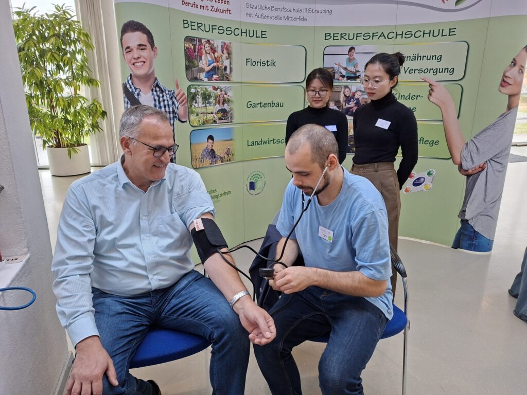Der Fachbereich Sozialpflege war gemeinsam mit dem Fachbereich Kinderpflege vertreten. Unter der Betreuung von Frau Röder und unterstützt von einem Schüler und zwei Schülerinnen der Sozialpflege 11, stellten sie die Ausbildungsinhalte praxisnah vor. Besonders beliebt war dabei die Möglichkeit, das richtige Blutdruckmessen selbst auszuprobieren Ein anschaulicher Einblick in die pflegerische Arbeit und die Verantwortung in sozialen Berufen.