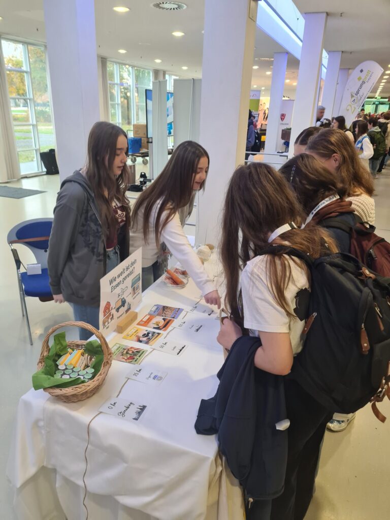 Der Fachbereich Ernährung und Versorgung, betreut von Frau Müller, lud zu einer interaktiven Aktion zum Thema „Transportwege unserer Lebensmittel“ ein. Dabei konnten Interessierte verschiedene Lebensmittel ihren typischen Transportwegen und -kilometern zuordnen Eine spannende Übung, die für so manche Überraschung sorgte und zum Nachdenken über Nachhaltigkeit und Regionalität anregte. Unterstützt wurde die Aktion von zwei engagierten Schülerinnen der Klasse EV 10.