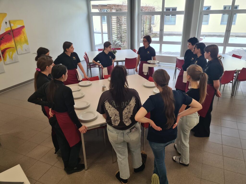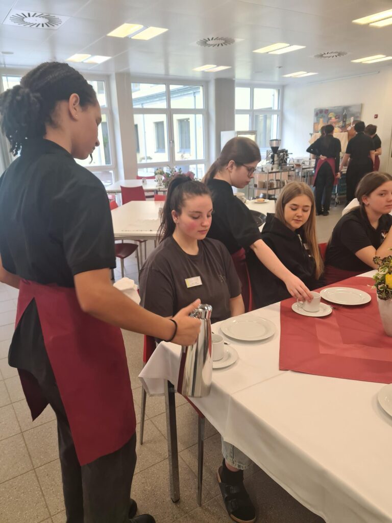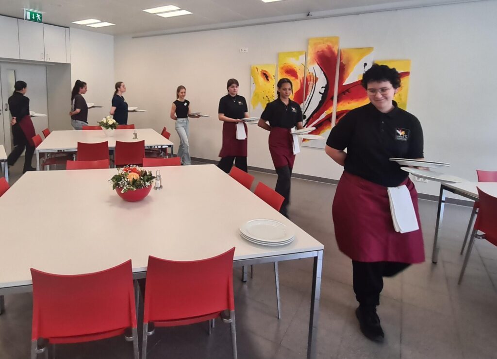 Im Fach Service lernten wir, wie wichtig in Österreich das Kulturgut Kaffeeservice ist. Service und Etikette werden hier GROSS geschrieben. Deshalb ist das schon im ersten Ausbildungsjahr im Fach Haushaltsmanagement Unterrichtsgegenstand.