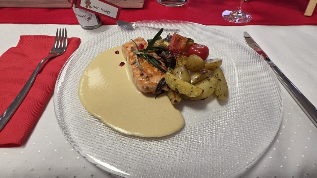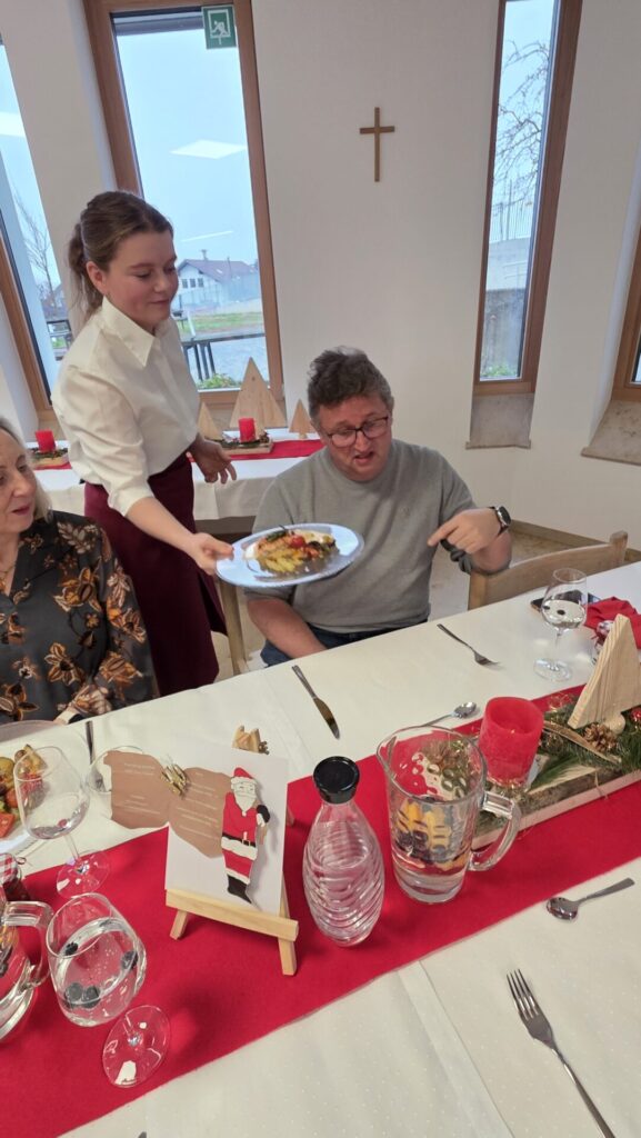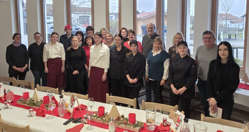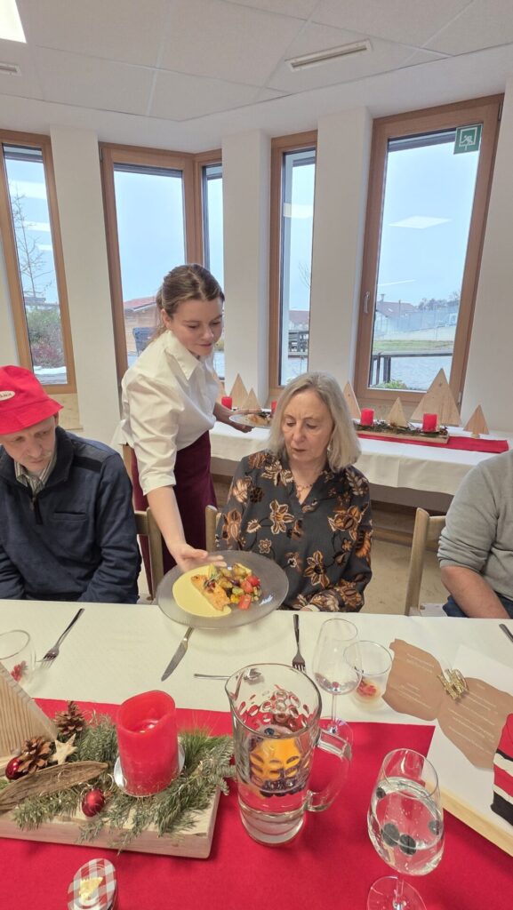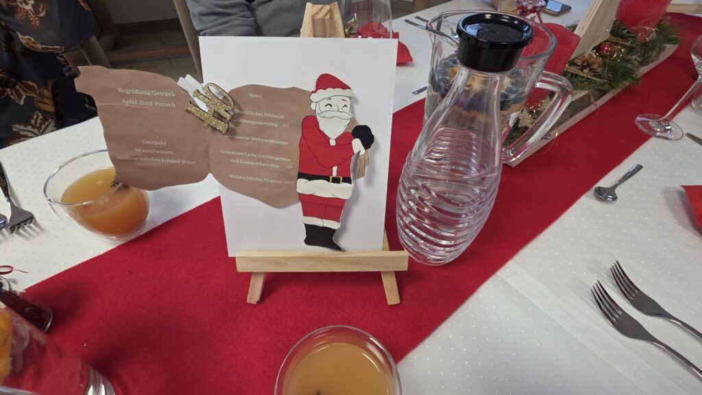 Die Bedeutung von Wertschätzung alltäglicher Arbeit wird oft unterschätzt und ist doch so wichtig. Genau aus diesem Grund, haben wir uns dafür entschieden mit den Schülerinnen und Schülern einmal im Jahr einen besonderen „Dank“ auszusprechen. Dieses Dankeschön kommt durch eine Einladung in der Vorweihnachtszeit an unser gesamtes Hauspersonal zum Ausdruck. Ihre Arbeit geschieht so oft im Verborgenen und sie fällt nur dann wirklich auf, wenn die Dinge nicht so funktionieren wie gewohnt. Im EuV-Unterricht planten die Schülerinnen mit Unterstützung von Frau Haaga ein festliches Vier-Gänge-Menü, passendende Getränke, einen weihnachtlichen Begrüßungsdrink und ein kleines Give-Away in Form von gebrannten Mandeln. Dabei achteten die Schülerinnen auf Nachhaltigkeit und Nahrungsmittelintoleranzen. Schon beim Lesen der selbstentworfenen Menükarte freuten sich unsere Gäste über das, was sie erwartete: